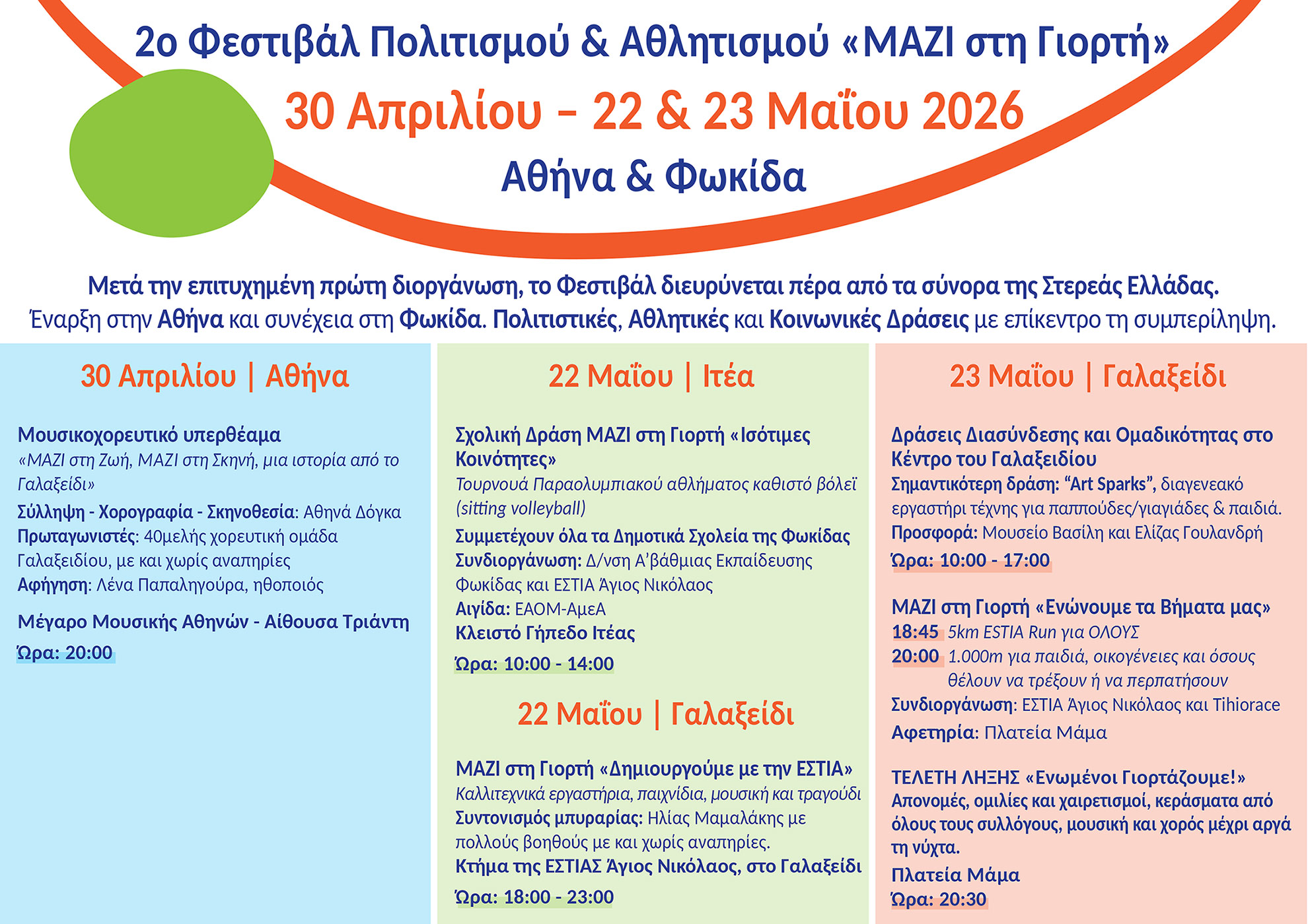 To φετινό 2ο Φεστιβάλ διευρύνεται πέρα από τα σύνορα της Στερεάς Ελλάδας, και ξεκινάει στην Αθήνα στις 30 Απριλίου με μια εμβληματική συμπεριληπτική παράσταση, πριν συνεχίσει στις 22 και 23 Μαΐου στην Φωκίδα με πολιτιστικές, αθλητικές και κοινωνικές δράσεις και εκδηλώσεις. Οι θεματικοί πυλώνες παραμένουν οι ίδιοι , αλλά εμπλουτίζονται με νέες δράσεις: